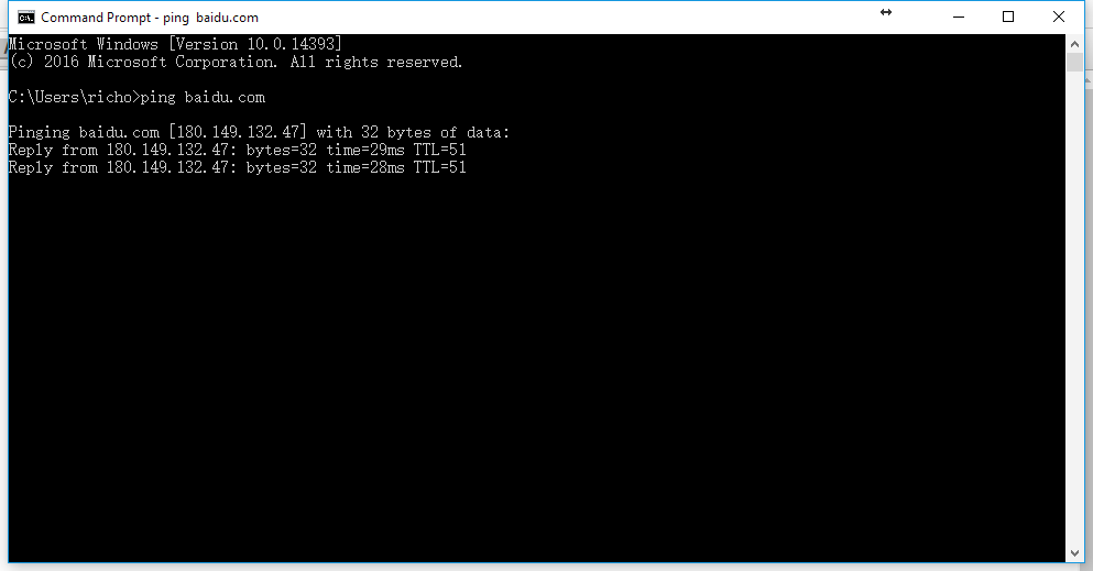 如:ping baidu.com(当您的域名无法访问时,请您将baidu.com替换为您无法访问的域名/IP)