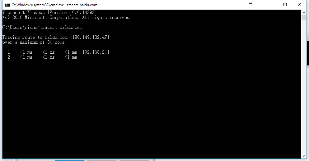 如:tracert baidu.com(当您的域名无法访问时,请您将baidu.com替换为您无法访问的域名/IP)
