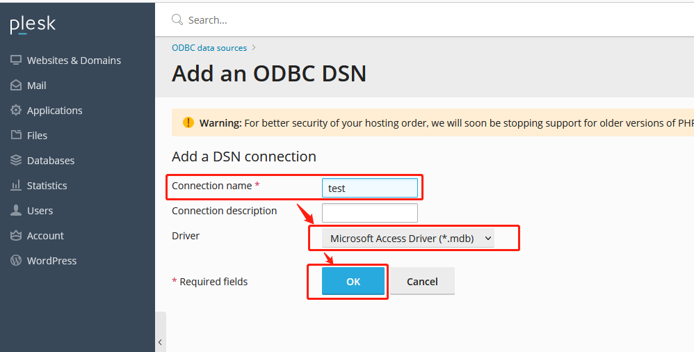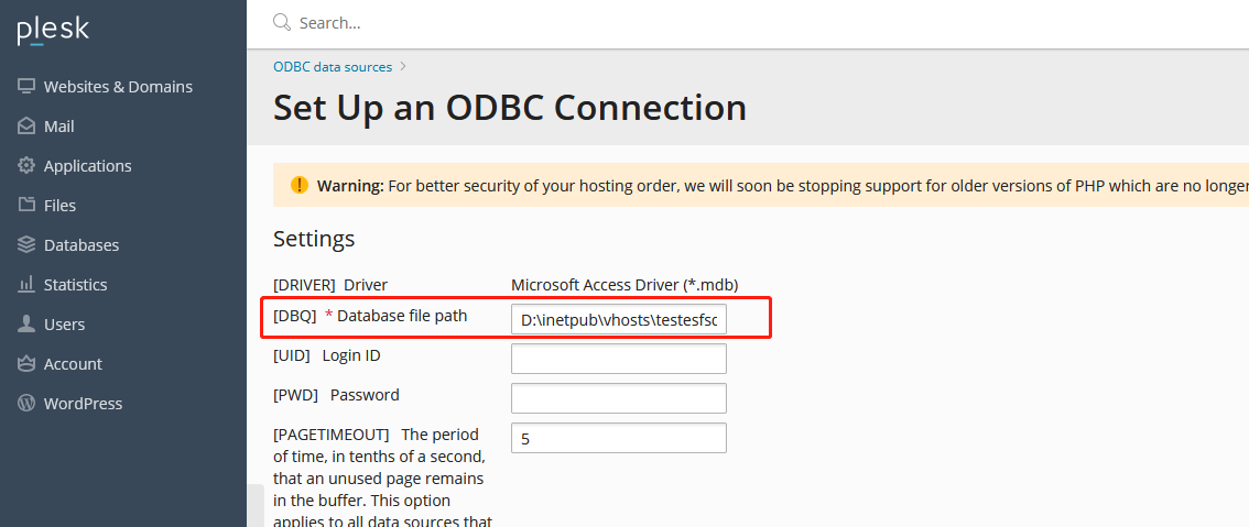 显示源文件修订记录反向链接回到顶部 windows虚拟主机配置odbc数据源 1.(以accesss 数据库为例)登录BH官网–点击我的账号–点击管理订单–罗列搜索订单—-点击主机域名进入,找到如图位置点击进入plesk。 2.点击 ODBC 数据源 —— 点击 Add ODBC DSN 进入按照以下操作 3.填写名字以及选择要添加的数据库类型,然后点击确认下一步,然后需要您填写数据库文件路径(这个需要填写绝对路径)。 4.以上填写路径后,直接点击 下一步即可,一直操作到添加完成即可。