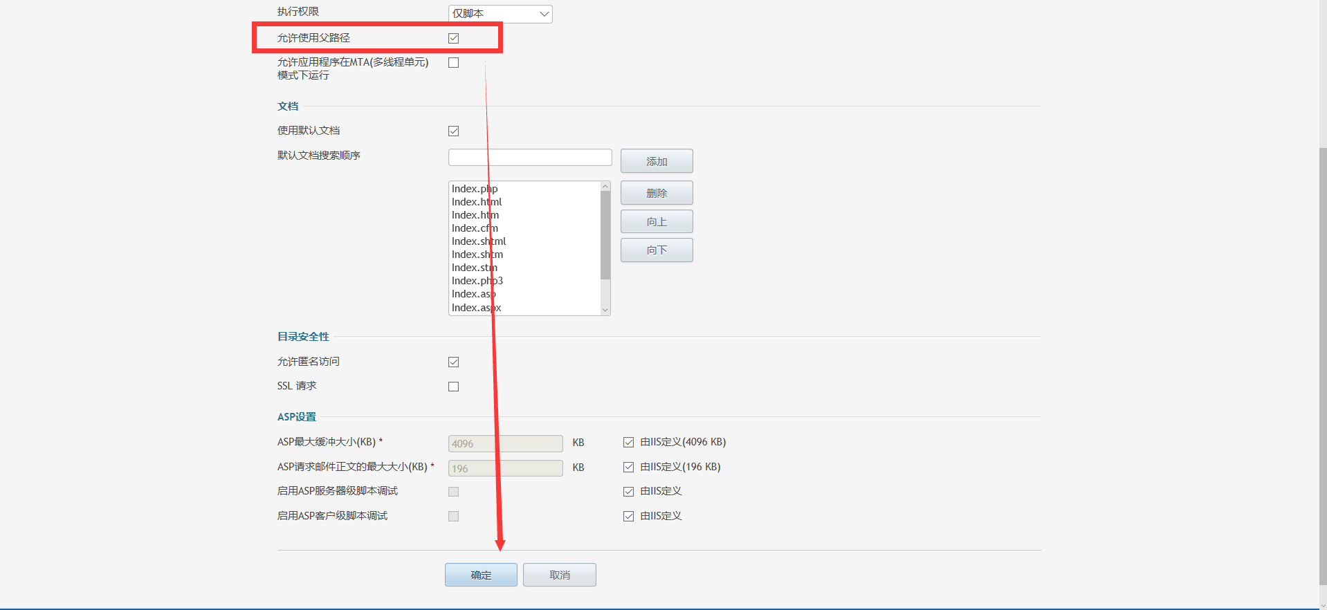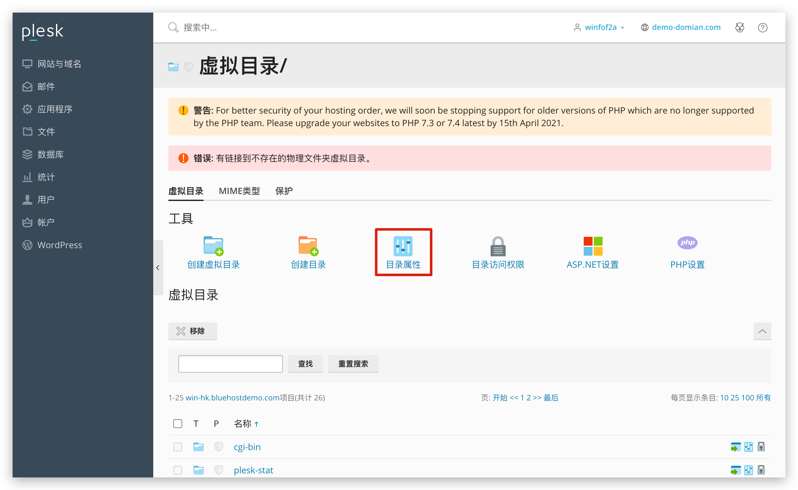显示源文件修订记录反向链接回到顶部 修改Windows主机父路径 1.进入Plesk管理面板,登陆方式:点击跳转 2.找到对应需要开启付路径的域名,点击页面中的“虚拟目录” 3.点击“目录属性” 4.找到父路径,将右侧的勾进行选中 5.选中后点击下方“保存”按钮,时间会比较长,需要耐心等待一下。