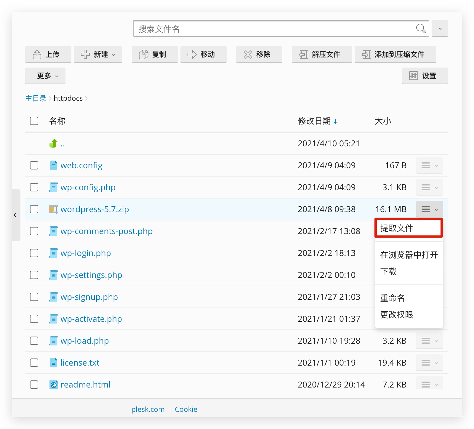 2.找到“文件”选项卡,选择对应的网站目录,并点击“上传文件”,默认主域名对应的默认文件夹为httpdocs